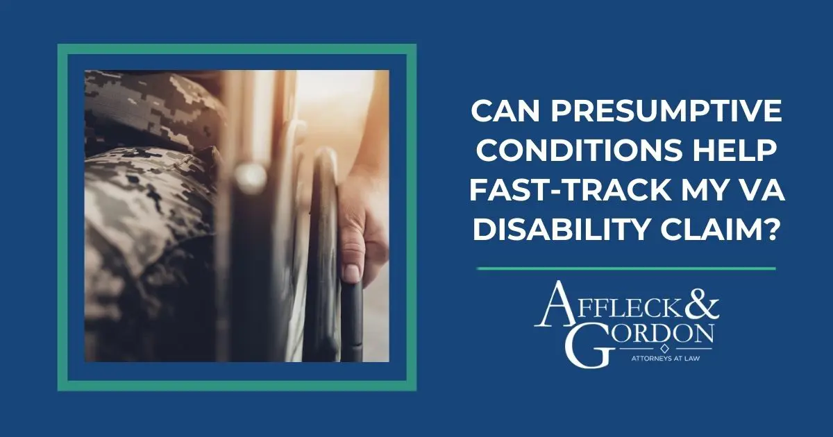 For many veterans, navigating the VA disability claims process can be complex and time-consuming. One way to potentially simplify and speed up your claim is through presumptive conditions. At Affleck & Gordon, we help Georgia veterans understand how these conditions work and how they can impact their VA disability claim.